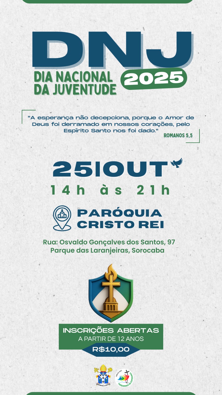 No dia 25 de outubro, das 14h00 às 21h00, a Arquidiocese de Sorocaba convida todos os jovens para viver um momento especial de fé, alegria e unidade. O Dia Nacional da Juventude (DNJ) é uma grande celebração que reúne jovens de todos os carismas, grupos, movimentos e comunidades em um mesmo coração.